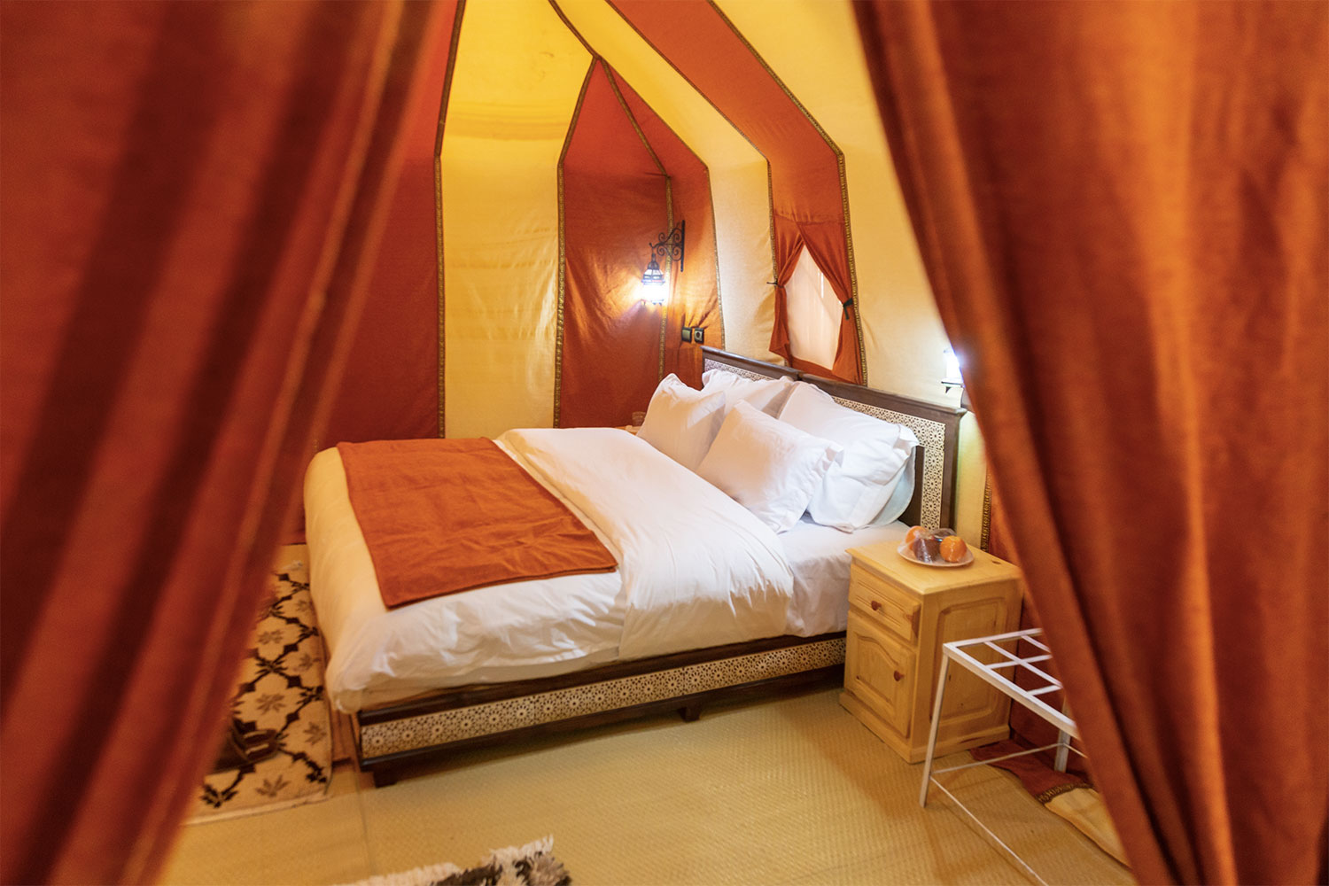 Every tent of the camp is widely separated from the others tents with a big space in the middle to provide best privacy to our guests. Every tent has selected bed linen and a wide ensuite private bathroom with everything you need for a highest comfortable stay including electricity and seating area in front of each tent and around the camp in the sand dunes.